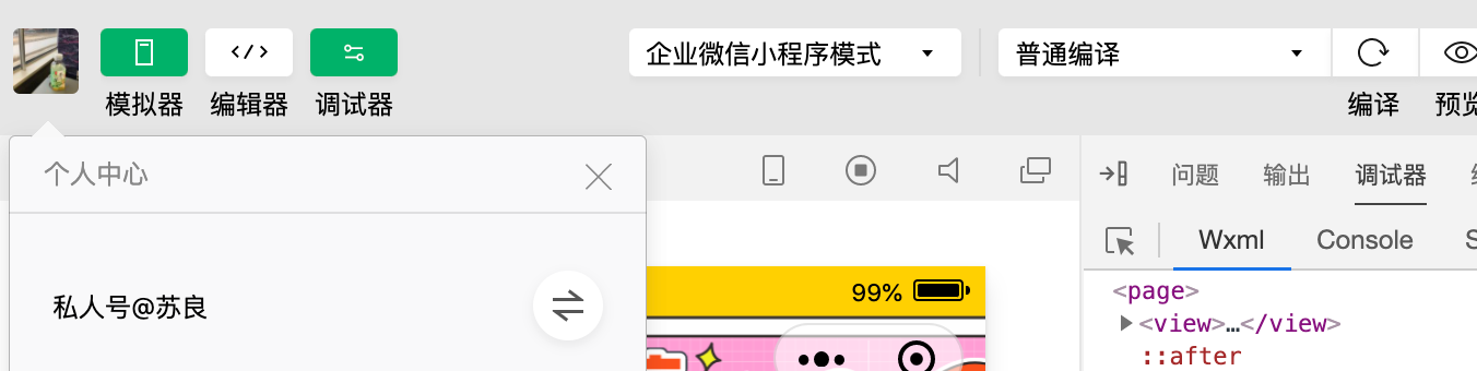 另外在开发者工具切换账号也神奇,如下图所示切换后,然后清除所有缓存,结果通过哦wx.qy.login获取的code换取的userid却维持上一个账户