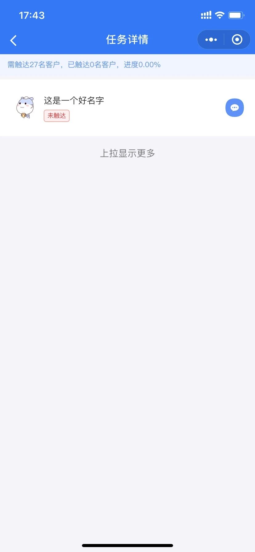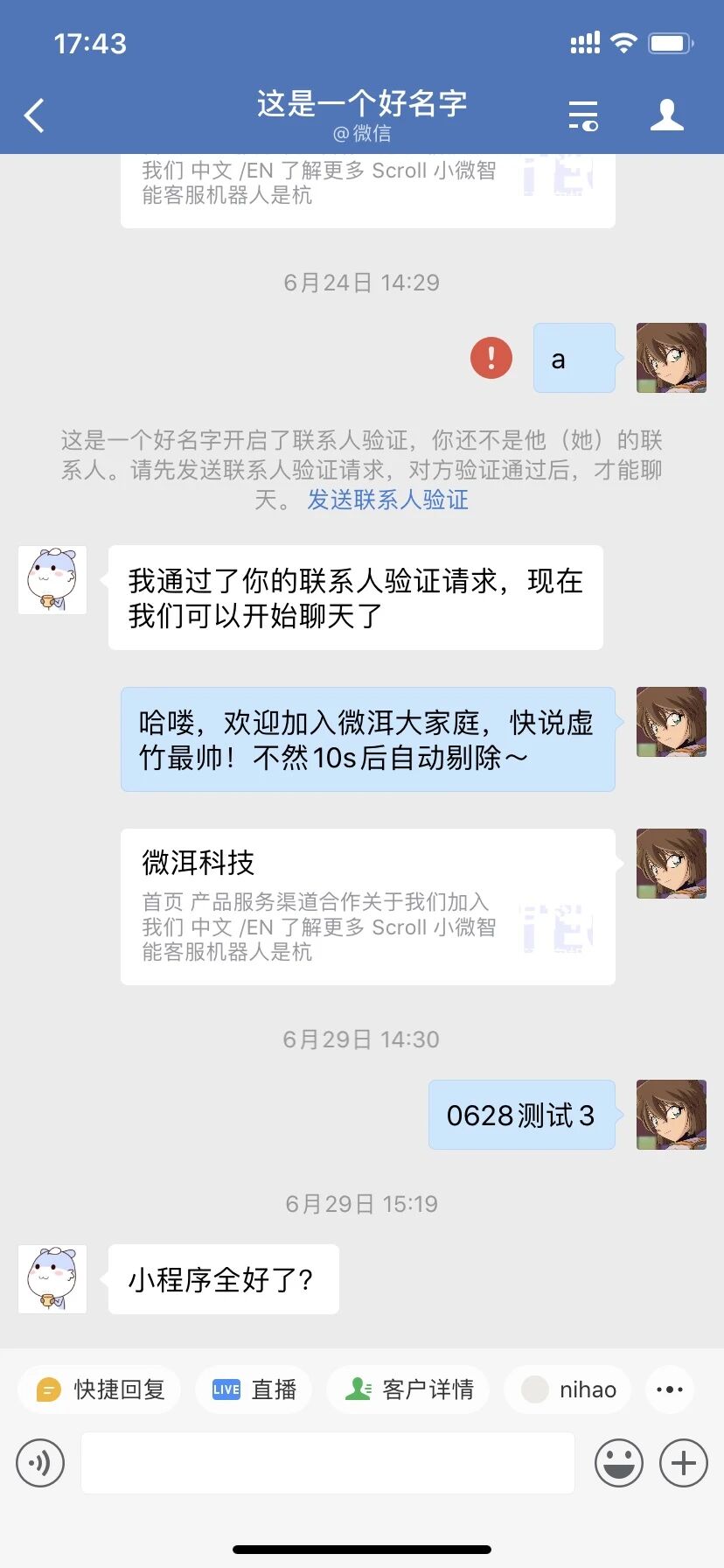 在小程序中使用 wx.qy.openEnterpriseChat方法打开第二张图,聊天窗的工具栏下方有配置好的小程序,点击【nihao】(当前小程序的另外一个页面),在iOS系统提示小程序已打开,安卓系统可以重新打开小程序