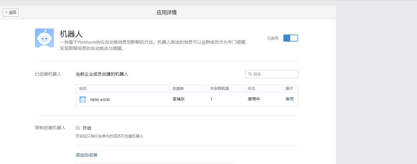 您好,目前群里面的成员都有权限添加群机器人与移除群机器人,可以在企业管理后台添加白名单,只有白名单内的才有权限创建机器人