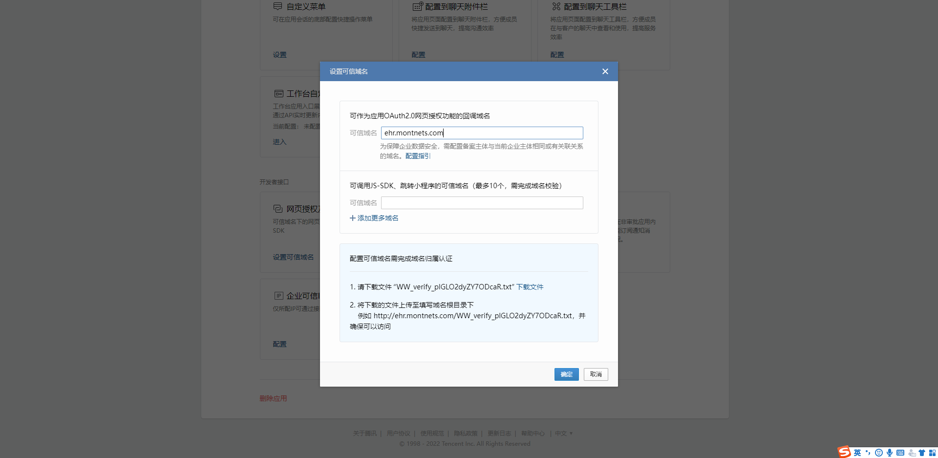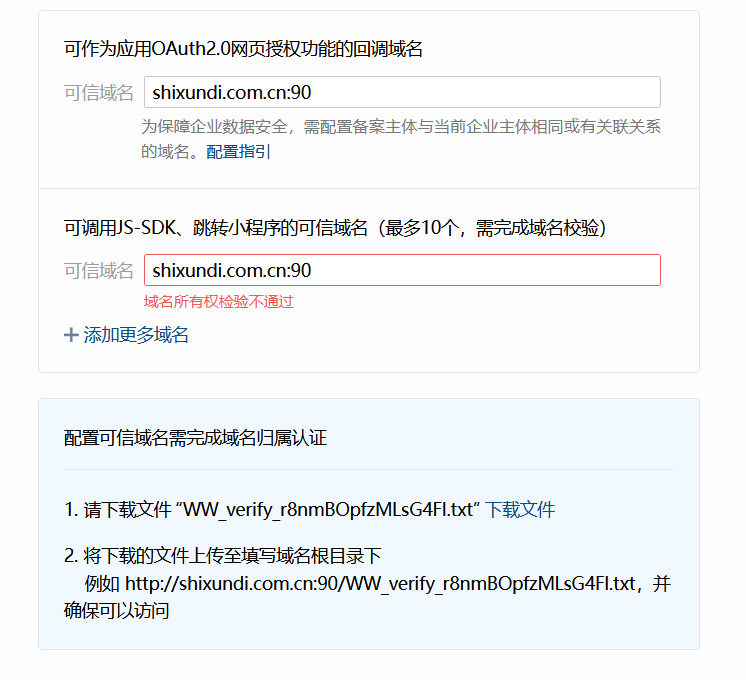 我们已经上传了对应的 txt,然后该txt 也可以直接访问到。但是在企业微信后台配置的时候,依然报错“域名所有权校验不通过”。