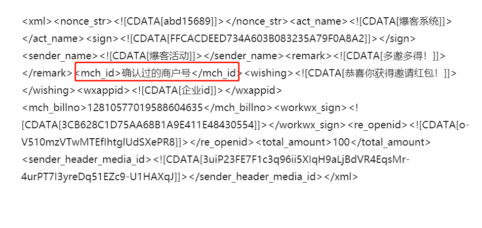<xml><nonce_str><![CDATA[abd15689]]></nonce_str><act_name><![CDATA[爆客系统]]></act_name><sign><![CDATA[FFCACDEED734A603B083235A79F0A8A2]]></sign><sender_name><![CDATA[爆客活动]]></sender_name><remark><![CDATA[多邀多得!]]></remark><mch_id>确认过的商户号</mch_id><wishing><![CDATA[恭喜你获得邀请红包!]]></wishing><wxappid><![CDATA[企业id]]></wxappid><mch_billno>12810577019588604635</mch_billno><workwx_sign><![CDATA[3CB628C1D75AA68B1A9E411E48430554]]></workwx_sign><re_openid><![CDATA[o-V510mzVTwMTEfIhtglUdSXePR8]]></re_openid><total_amount>100</total_amount><sender_header_media_id><![CDATA[3uiP23FE7F1c3q96ii5XIqH9aLjBdVR4EqsMr-4urPT7I3yreDq51EZc9-U1HAXqJ]]></sender_header_media_id></xml>