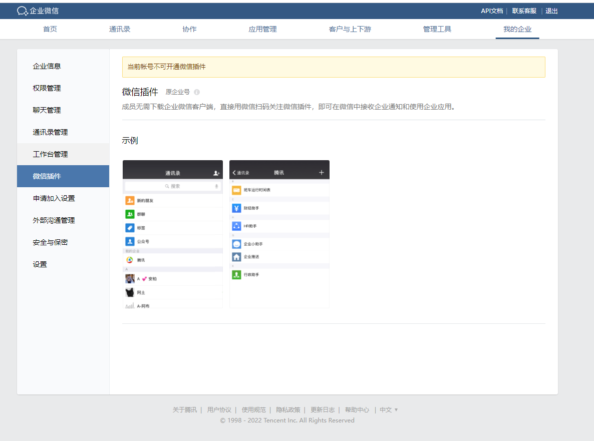 而在这个企业微信web管理后台-我的企业-微信插件中,打开提示无法开通微信插件,请问这是什么原因?