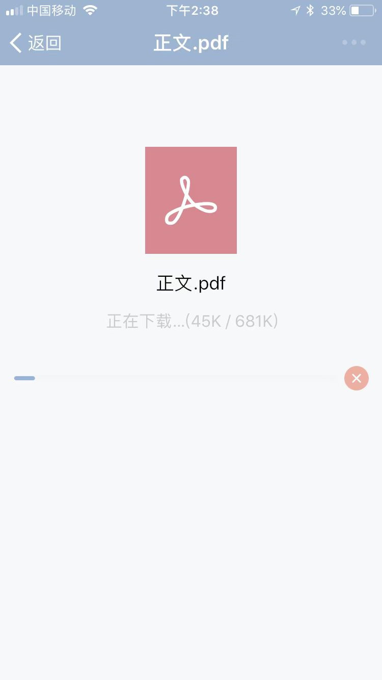在安卓平台上能正常显示PDF,但是在IOS上进行预览的时候下载卡在45KB这。把传入wx.previewFile的url参数复制在苹果浏览器上访问能正常预览PDF。