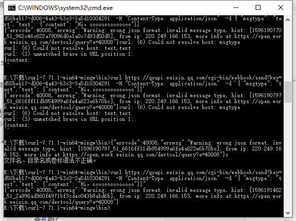 您好,看日志是消息类型为空,invalid msgtype, req.msgtype() 看截图也是这样提示,应该是文本内容问题,严格按照文档这个格式进行执输入看看 curl 'https://qyapi.weixin.qq.com/cgi-bin/webhook/send?key=693axxx6-7aoc-4bc4-97a0-0ec2sifa5aaa' \ -H 'Content-Type: application/json' \ -d ' { "msgtype": "text", "text": { "content": "hello world" } }'您好,我想问一下这个格式好像没问题吧,为什么发送失败呢?