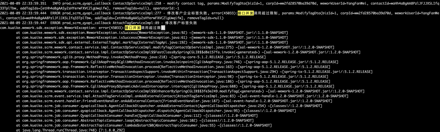问题:编辑客户标签接口,频繁出现“接口并发调用异常”(error45033),调用间隔时间为3分30秒和1分30秒。从使用日志上来看,并没有频繁的或多线程的调用打标签的接口,但是仍然经常出现“并发调用异常”的错误,请问是什么原因呢???