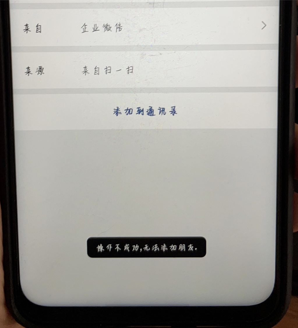 微信客户通过二维码加企业微信时,提示(如图):操作不成功,无法添加朋友