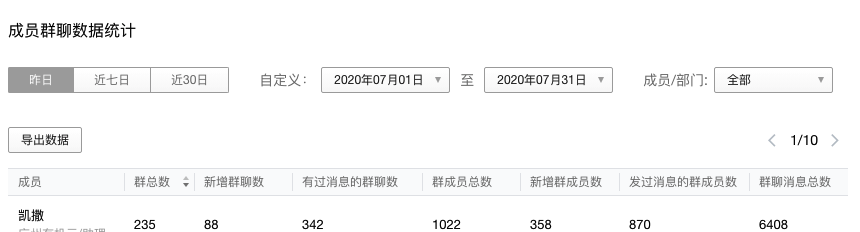 1.目前支持的群聊数据统计仅仅只是某个成员或者企业全部群的统计数据,不能查看到每一个群的明细数据。