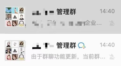 发现自己个人微信上有两个相同的群,以前那个右边带一个企业微信的LOGO,聊天记录都在那上面。