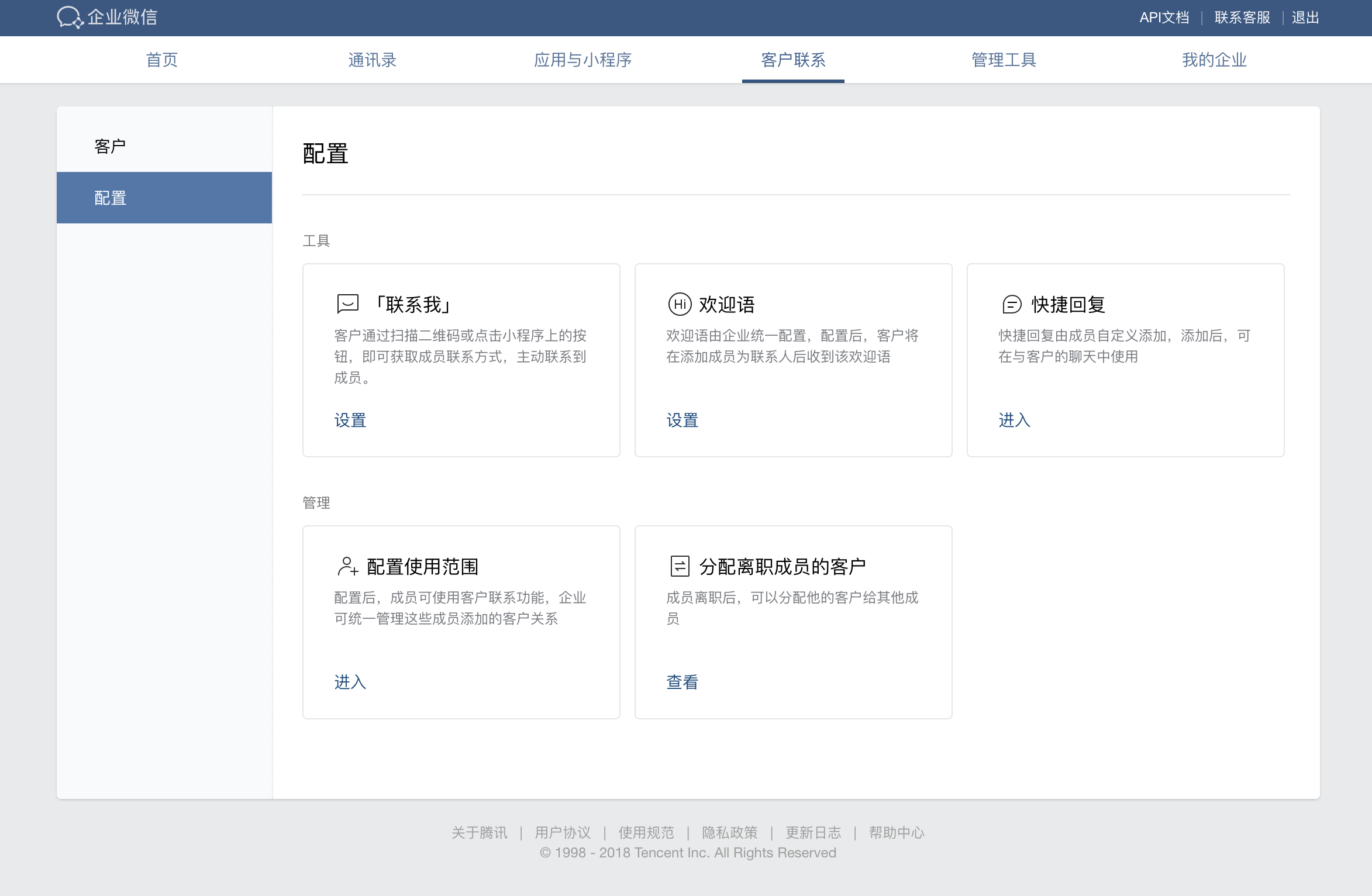 进入“配置”-“配置使用范围”页面,管理员设置哪些人可使用联系客户功能,如未配置,则无法调用后文提到的相关接口。
