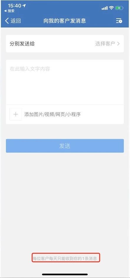 手机版的企业微信 工作台->客户联系->群发助手 内的发送消息,这里提示的是“每位客户每天只能收到你的1条消息”
