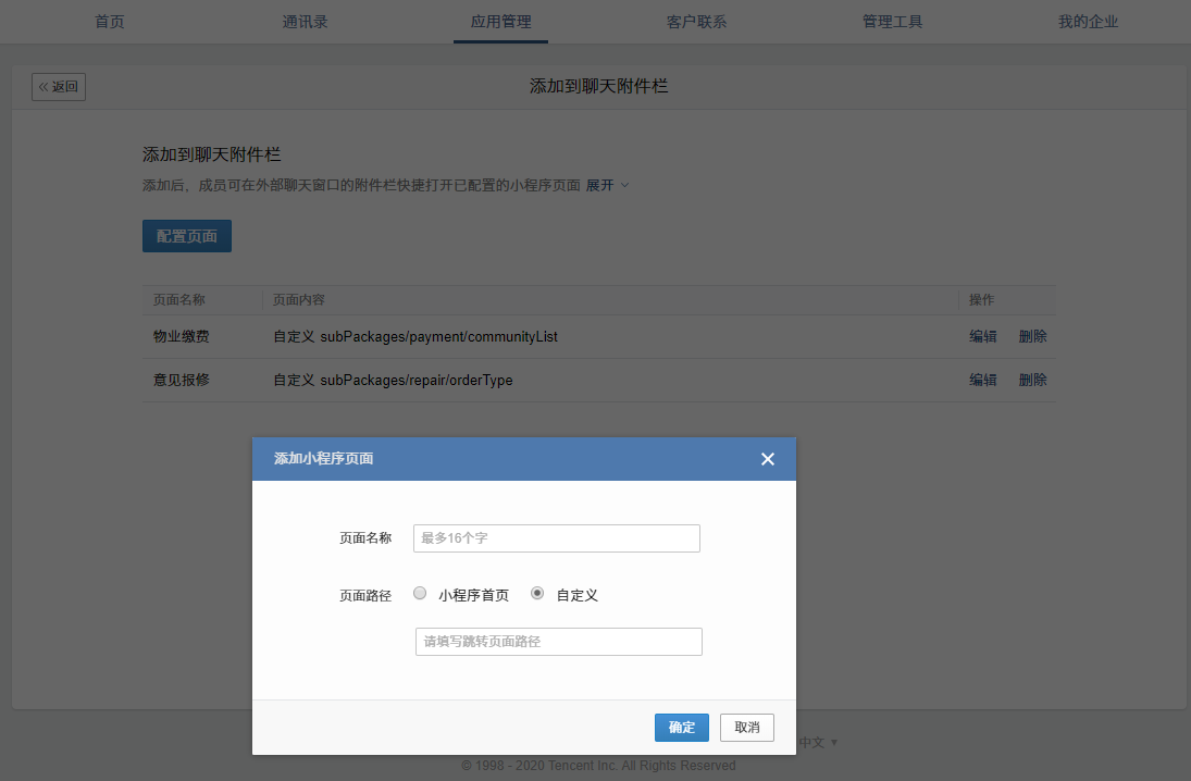 您好,进入关联的小程序应用,有个配置到聊天工具栏按钮,进入外部联系人聊天界面就有这个入口了