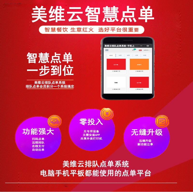 预约取号,远程查看实时排队进程,叫号消息提醒,排队超时自动赠送电子优惠券;远程点单,在家、排队、逛街时都可通过网络提前点单,到店即可用餐、取货。扫码自助下单,无需服务员,订单实时传送至后厨打印机;支持自建外卖平台,免受第三方外卖平台佣金绑架。