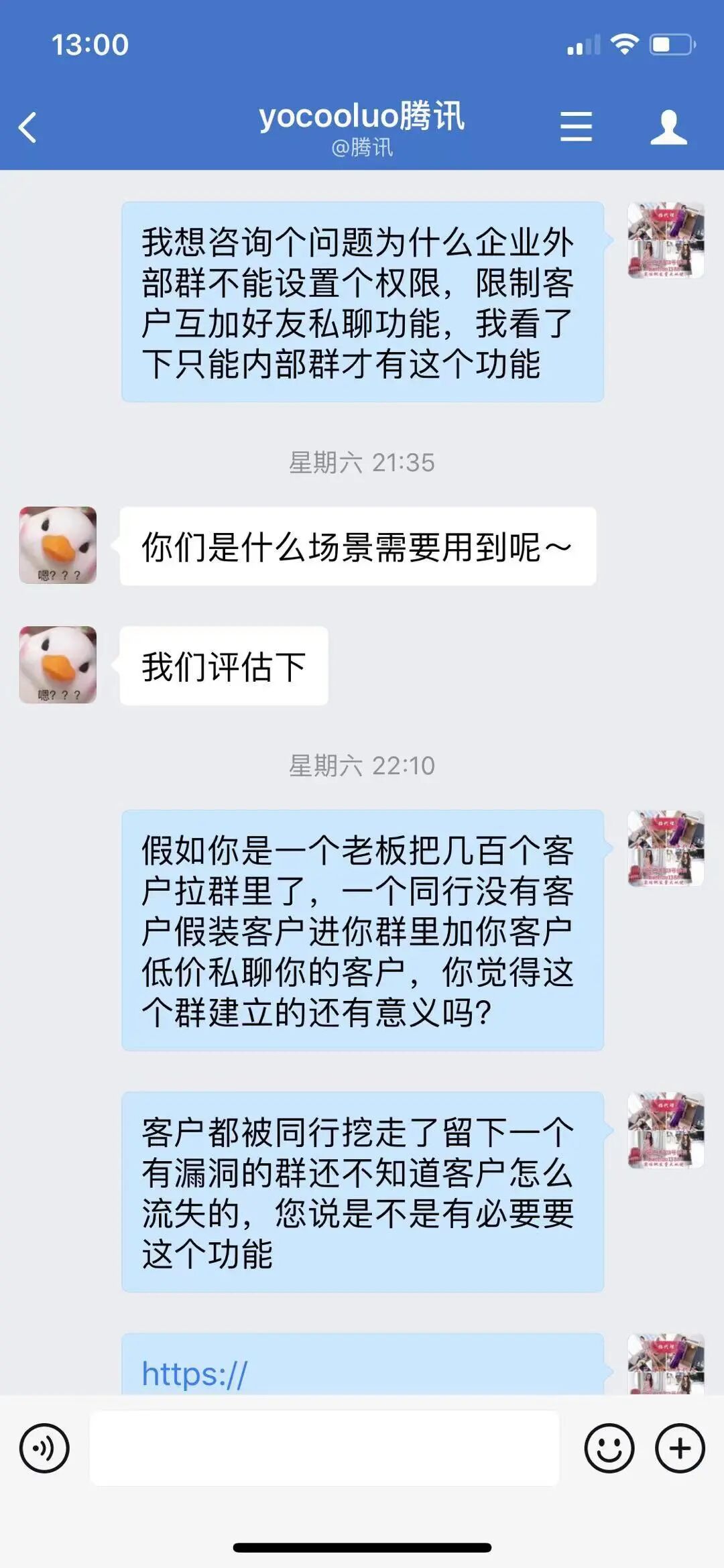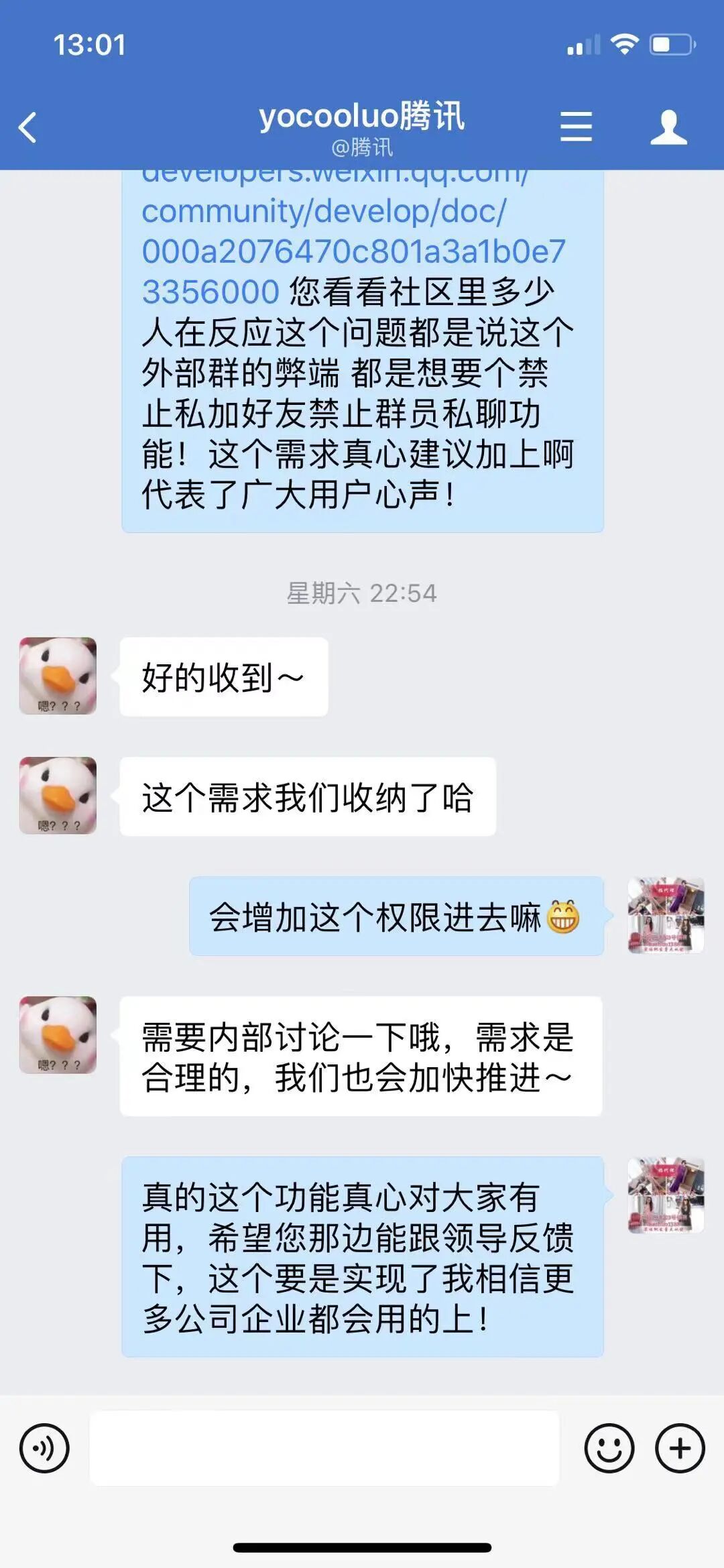 求求官方赶紧把外部群增加禁言和私加好友功能啊,好不容易积累上千个客户拉群里,一个同行进群偷偷加好友把客户抢完了!官方工作人员能理解这种痛苦吗?