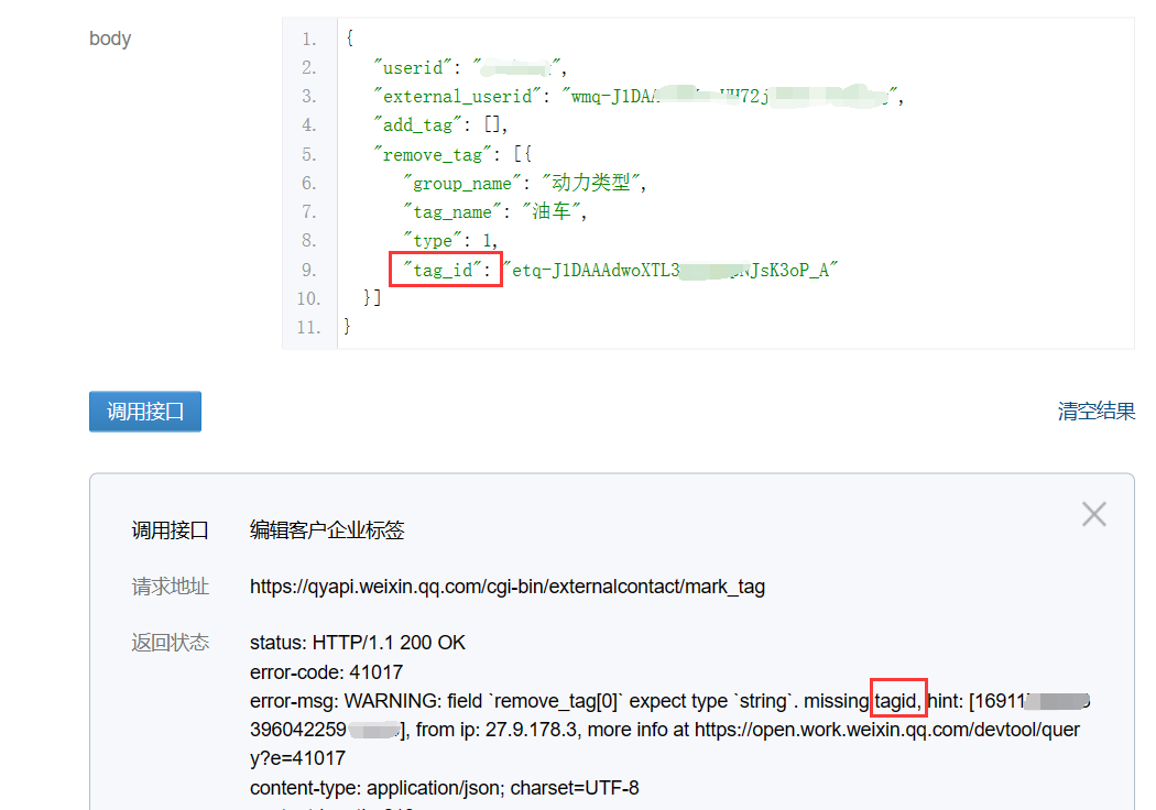 "errmsg": "missing tagid, hint: [1605853949_107_1adac683acbfcac087991b50f29e2992], from ip: 182.150.27.228, more info at https://open.work.weixin.qq.com/devtool/query?e=41017"