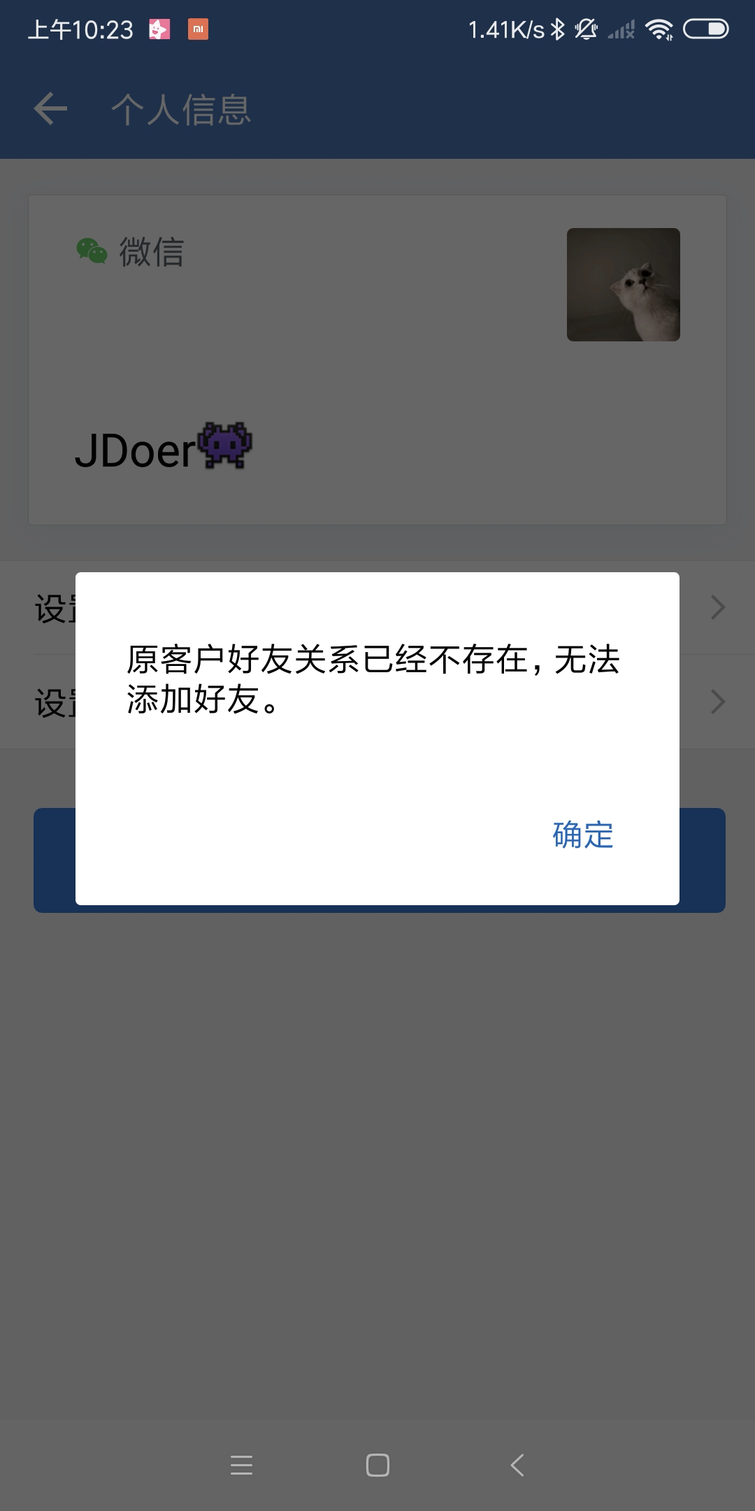 2.在可以打开个人信息页的终端点击添加好友,提示原客户好友关系不存在,无法添加好友,这是为何?