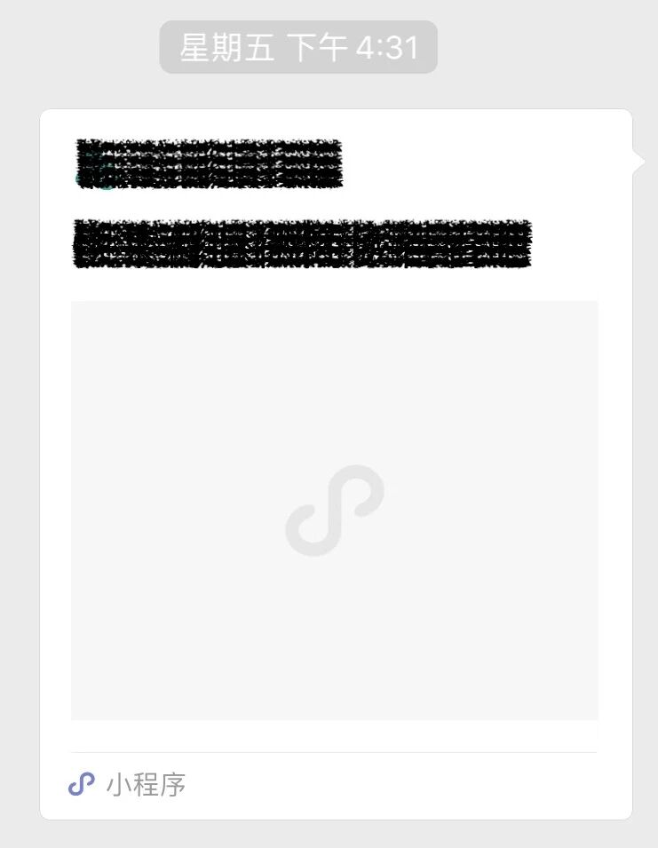 在没有设置分享的页面点击发送,发出的卡片类似上图,是小程序当前页面的截图,而在设置了分享页面的并且有设置 imageUrl 的页面点击这个发送按钮,发出来的卡片类似下图是空链