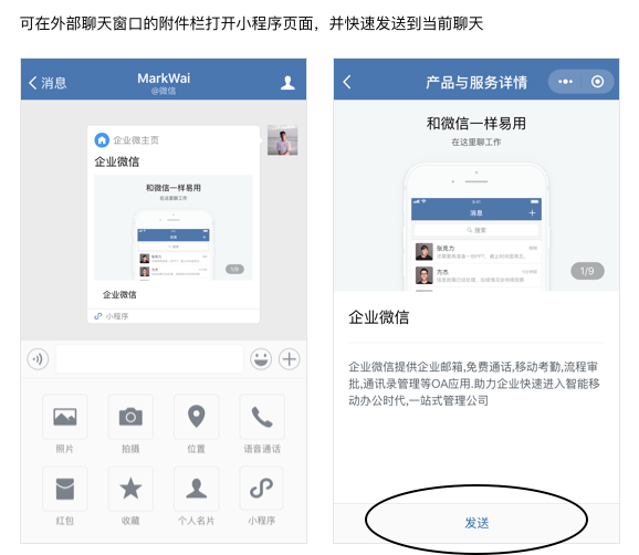 企业微信聊天栏附件配置小程序后,在外部会话的“+”号入口,支持企业配置小程序页面,方便成员可以更快速的将小程序页面发送给外部联系人。
