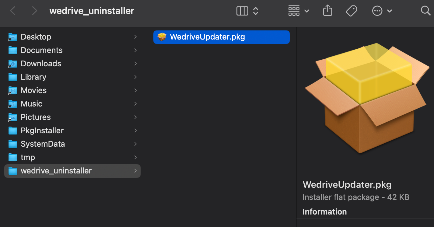 3、重新启动企业微信查,微盘仍未恢复正常,点击微盘按钮后自动打开路径 /Users/username/Library/Containers/com.tencent.WeWorkMac/Data/wedrive_uninstaller 里面有个WedriveUpdater.pkg,这应该是提示点击更新