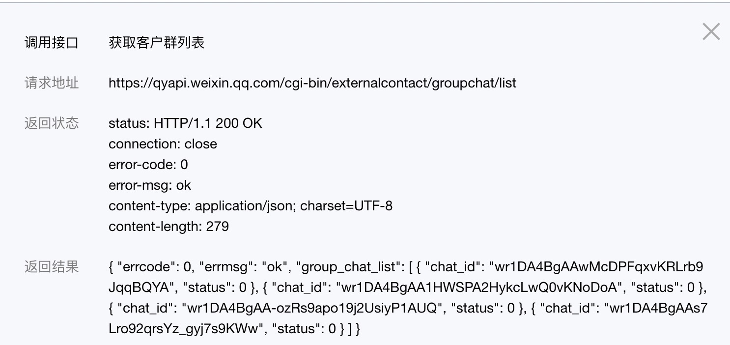 问题: 使用程序拉取接口一直拉取不到新建的外部群, 然后使用官方调试工具如上图,也拉取不到新建的群