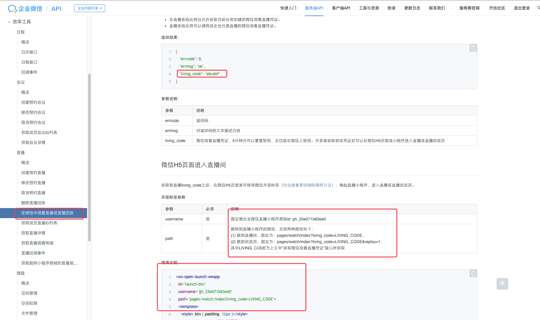 我们通过企业微信的直播功能创建了直播,根据livingid 调用接口获取了living_code,根据示例开发了H5 调用小程序