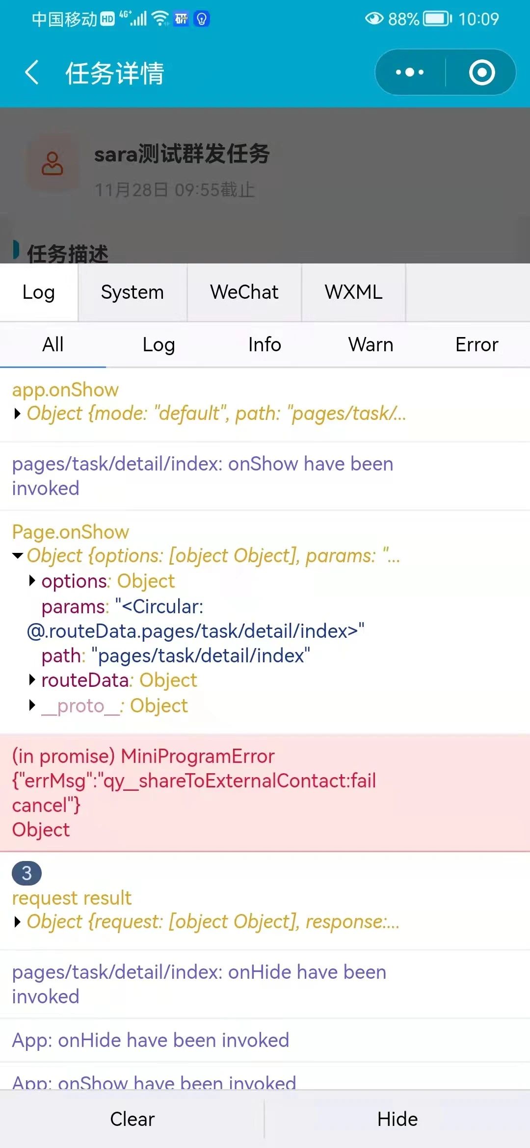 问题:使用 wx.qy.shareToExternalContact() 群发给客户后,接口返回 qy__shareToExternalContact:fail cancel,导致成功回调函数不执行并且多出一个空白页面。