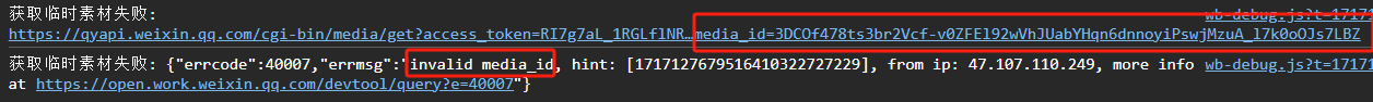 在上传临时素材成功后, 使用返回的media_id, 来请求 "获取临时素材"(https://developer.work.weixin.qq.com/document/path/90254), 返回 {"errcode":40007,"errmsg":"invalid media_id, hint: [1717127679516410322727229], from ip: XXXXX, more info at https://open.work.weixin.qq.com/devtool/query?e=40007"}