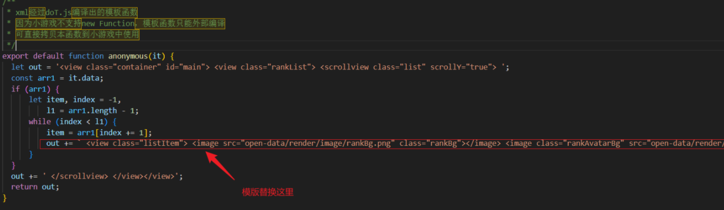 2)编辑模版样式 由于小游戏没有new Function 或者 eval 的能力,所以模版的编译只能在外部完成,然后将模版的内容复制到WX-WASM-SDK-V2/Runtime/wechat-default/open-data/tpls/friendRank.js文件中,这里可以寻找前端朋友帮助