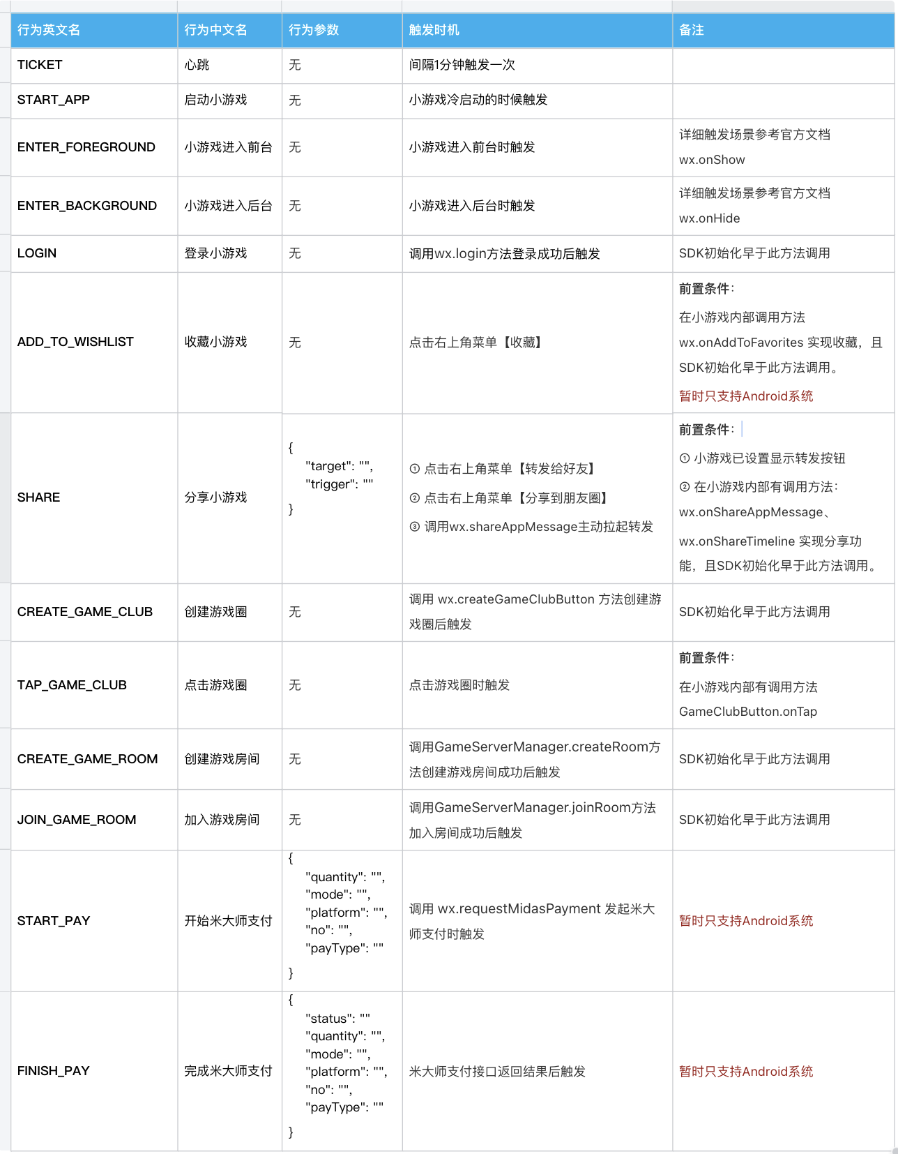 自动埋点一般是为了提高埋点效率,采用监听事件或者重写生命周期方法的方式来自动上报部分行为事件,埋点效率相对较高。小游戏SDK从 V1.1.0 版本开始支持行为自动采集的能力,以下 13 种行为无需开发者手动埋点上报: