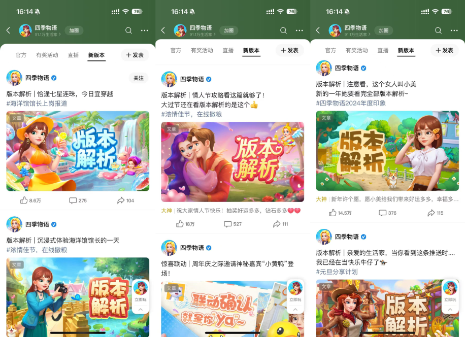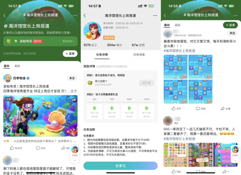 《四季物语》创建了结合游戏版本的“海洋馆馆长上岗报道”创作任务,以游戏内玩家最刚需的“体力”道具吸引玩家发表互动,活动上线仅3日便收获了1000条+帖子、300w+曝光。