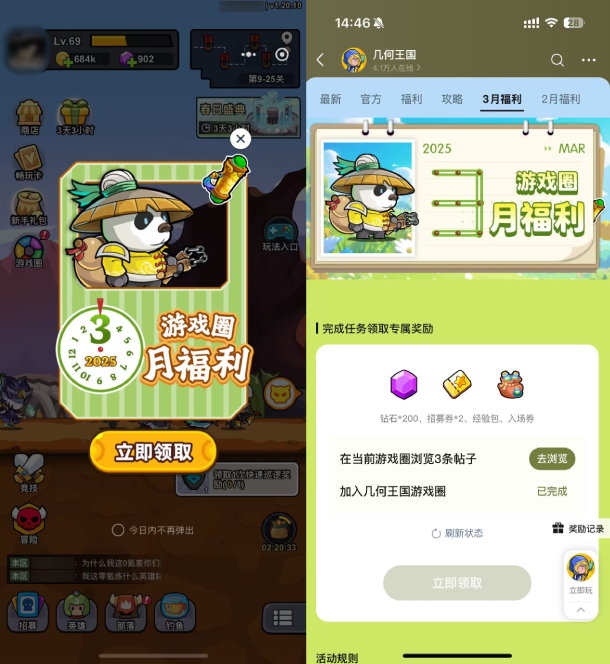 《几何王国》以每月为纬度创建游戏圈活动,玩家仅需完成简单的任务即可领取高价值道具礼包。