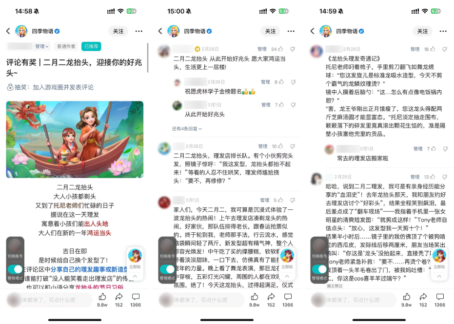 通过将活动与现实节日相结合,《四季物语》的评论有奖活动以游戏道具为激励,引导玩家在帖子内进行评论盖楼,回复质量高且内容新颖有趣,帖子收获1000+评论回复。