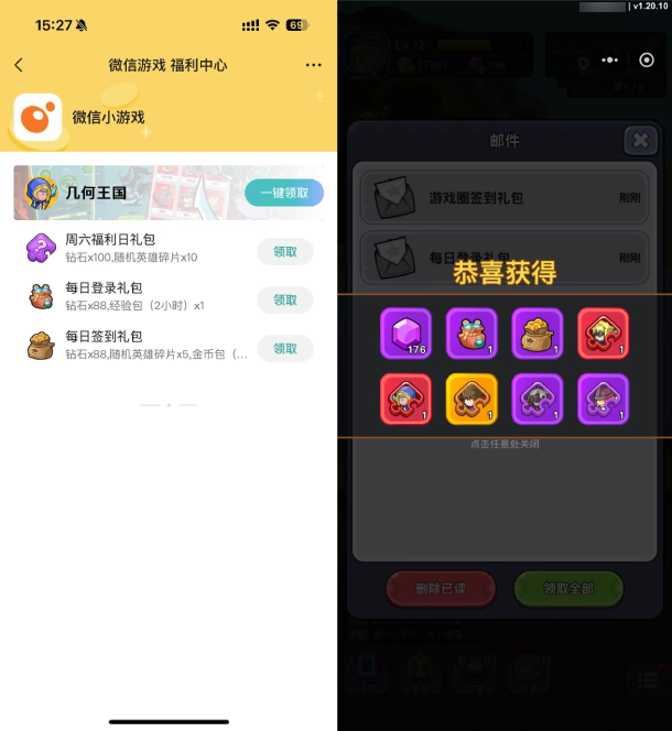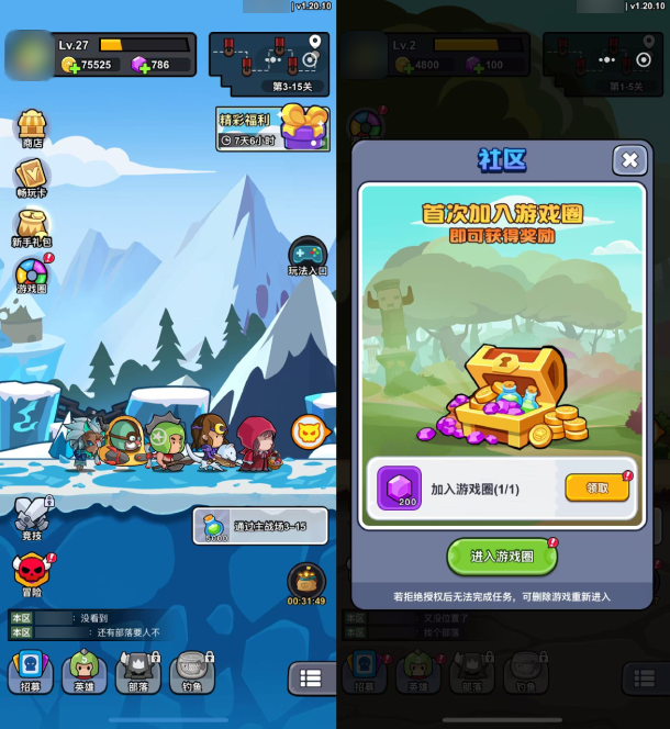 《几何王国》游戏圈内接入低门槛礼包,玩家每日登录/签到即可领取游戏道具,且提供的钻石/经验包等皆为游戏刚需,有效激励玩家每日访问游戏圈。