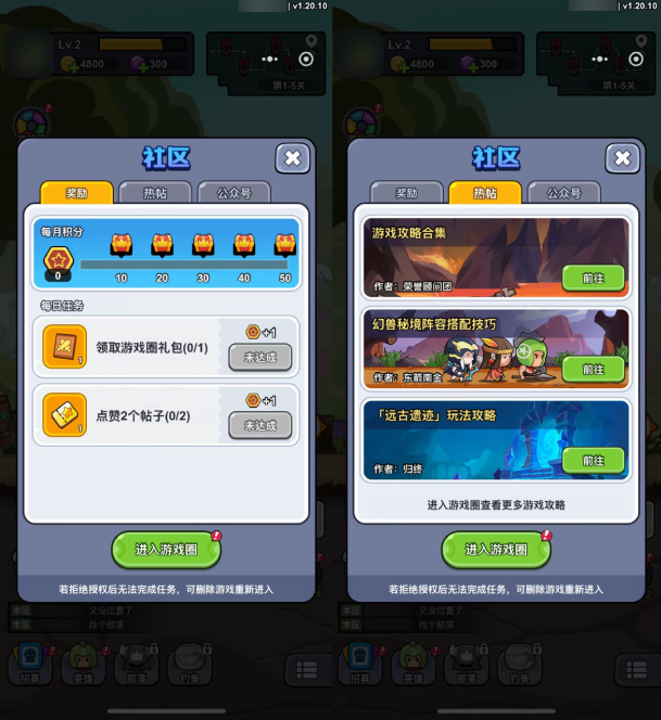 完成加圈后,游戏通过每日任务+每月积分的活动形式进一步引导玩家访问游戏圈,并在游戏内精选展示游戏圈优质帖子(攻略向)和热门互动讨
