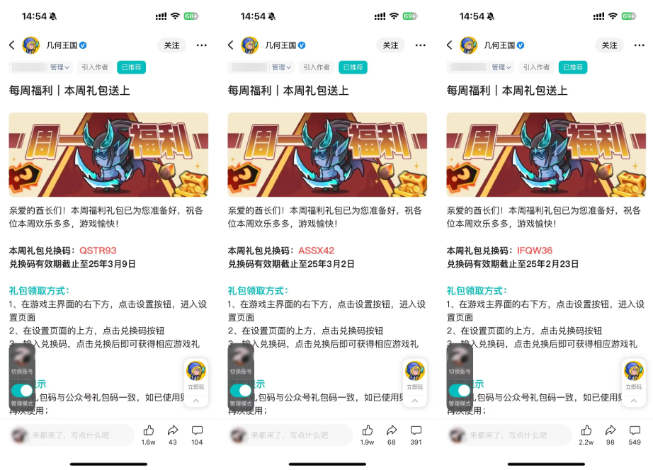 游戏每周一都会在圈子内发布礼包兑换码官帖,条均获赞1.8w+,得到了一众玩家的好评,提升了玩家在圈子内的留存率。