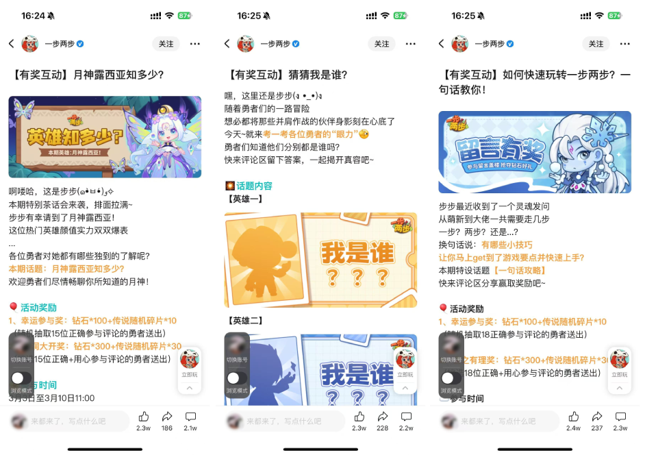 官方定期发有奖互动帖子,低门槛的参与形式和高价值的奖励道具有效提升了玩家在游戏圈内的参与度,互动贴评论回复条均破2w+。