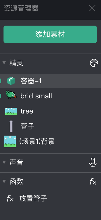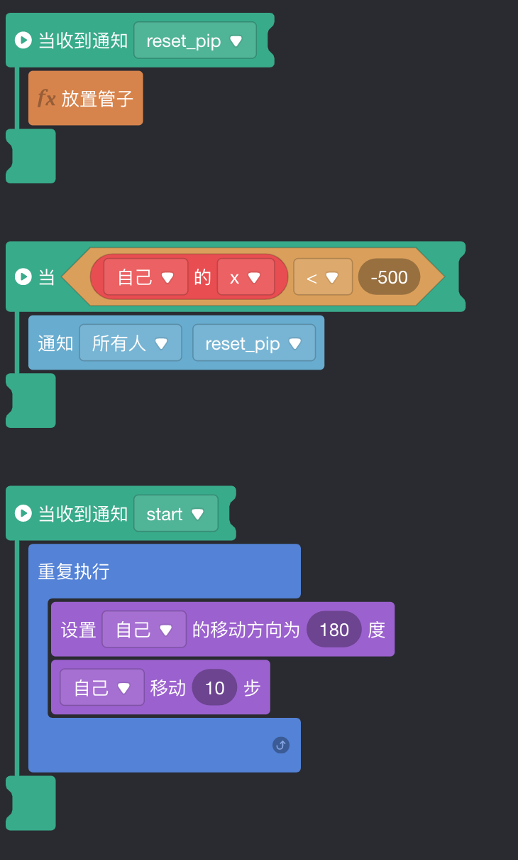中间的逻辑是,如果发现自己 X 坐标小于-500,也就是跑出了屏幕的左边,则发一个reset_pip的通知。这里完整的逻辑是,屏幕里面仅会出现一对柱子,每次从右往左移动,离开屏幕以后重新设置自己的Y坐标,这样看起来就是无限且随机高度的柱子了。当收到 reset_pip 通知的时候,这里使用了一个函数。函数在积木面板里面可以新建,创建好以后在资源管理器里面。