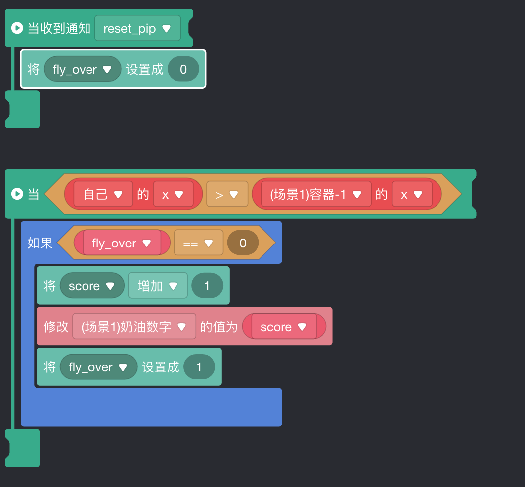 先看下面,当小鸟的X坐标,大于了容器(柱子)的X坐标,即小鸟飞过了柱子。则把score增加1。注意这里新增了两个变量一个是小鸟自己的私有变量fly_over,一个是全局变量score。
