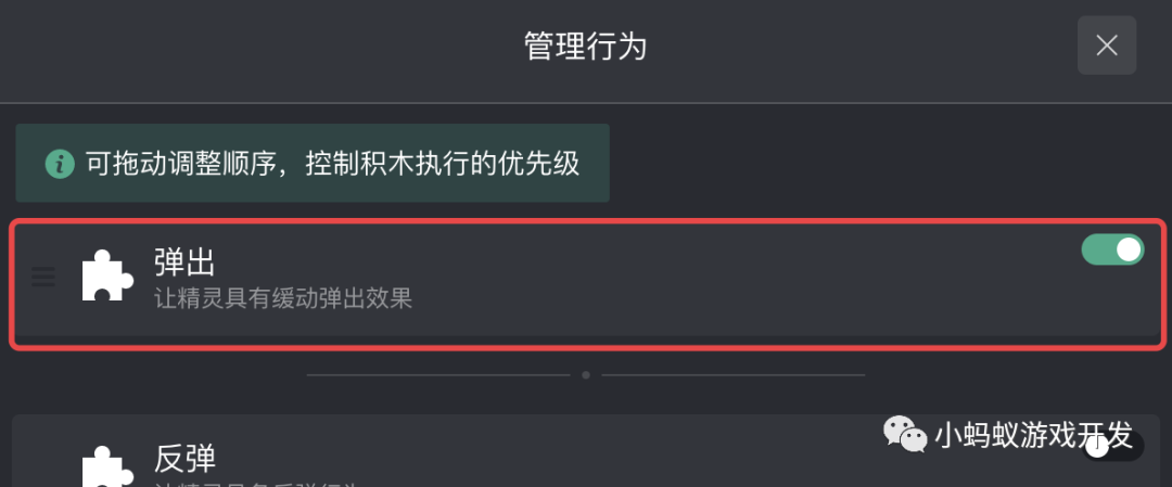 接下来,我们制作一个弹出按钮,与抖动按钮一样,我们也为弹出按钮新建一个容器,然后为其添加一个“弹出”行为。