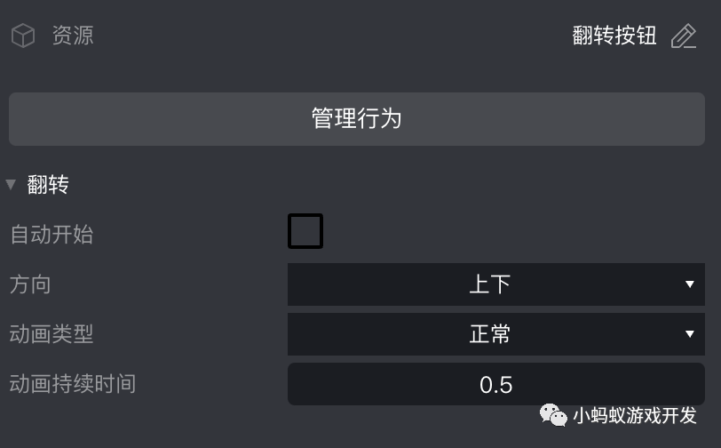同样的创建一个“翻转按钮”的容器,为其增加一个“翻转”行为。