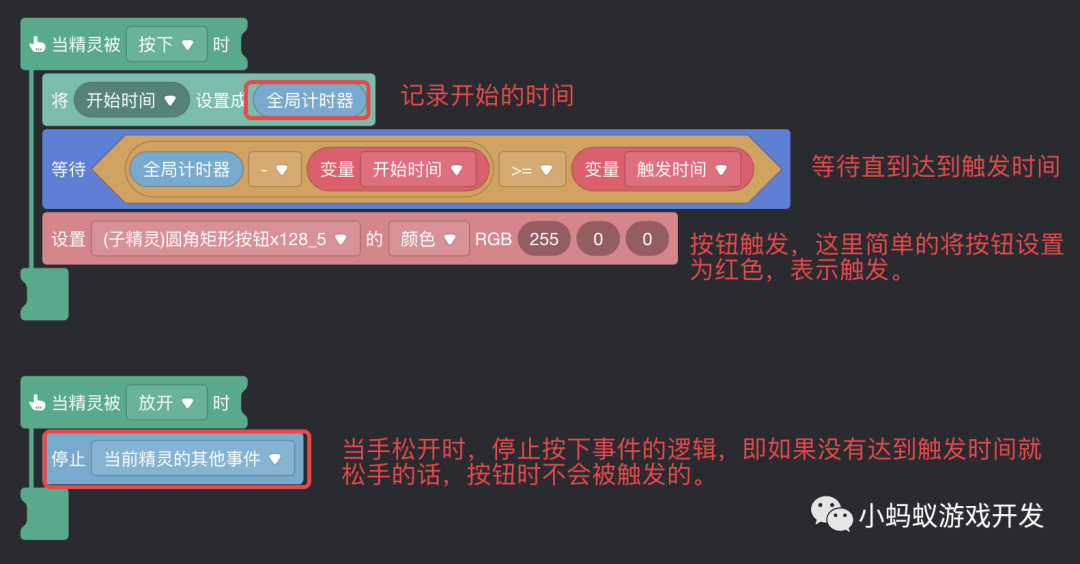 了解了这两块积木,游戏逻辑就比较好理解了,当按下时,先记录开始时间,然后去不停的判断当前度过的时间是否超过“触发时间”,超过的话,则执行触发逻辑(这里将按钮变红当作触发)。如果在等待期间松手了,那么就强行终止按下的逻辑,按钮也就没有机会被触发了。