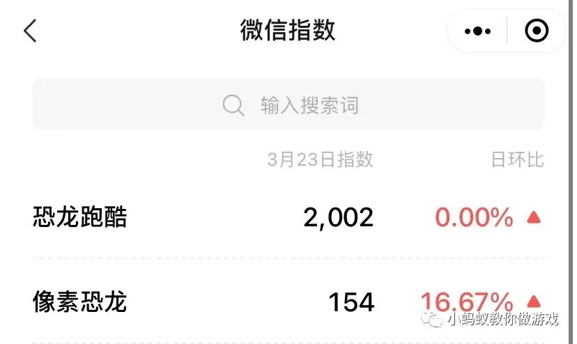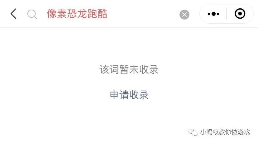 《像素恐龙跑酷》虽然感觉还可以,但在微信指数里面没有被收录,说明在微信这个生态系统里面,这个词是没有热度的,没有人搜这个词或者搜的人很少,如果用这个名字做小游戏的名字,上线之后可想而知是没有自然搜索用户的。
