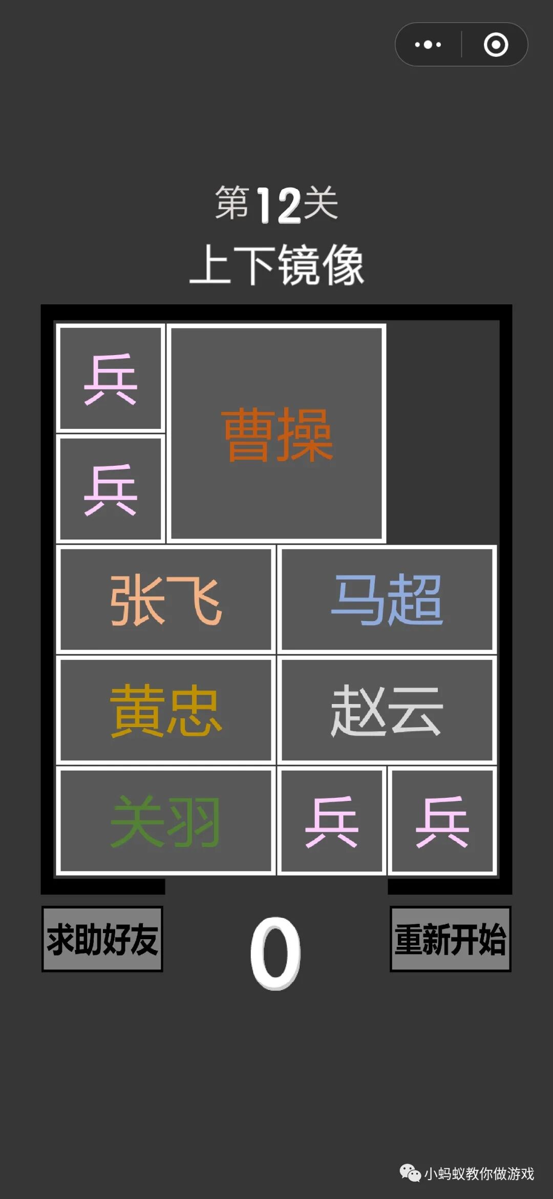 今天要介绍的是小蚂蚁游戏开发课程学员@Sing的一款小游戏作品曹操别想逃,是一个华容道游戏。