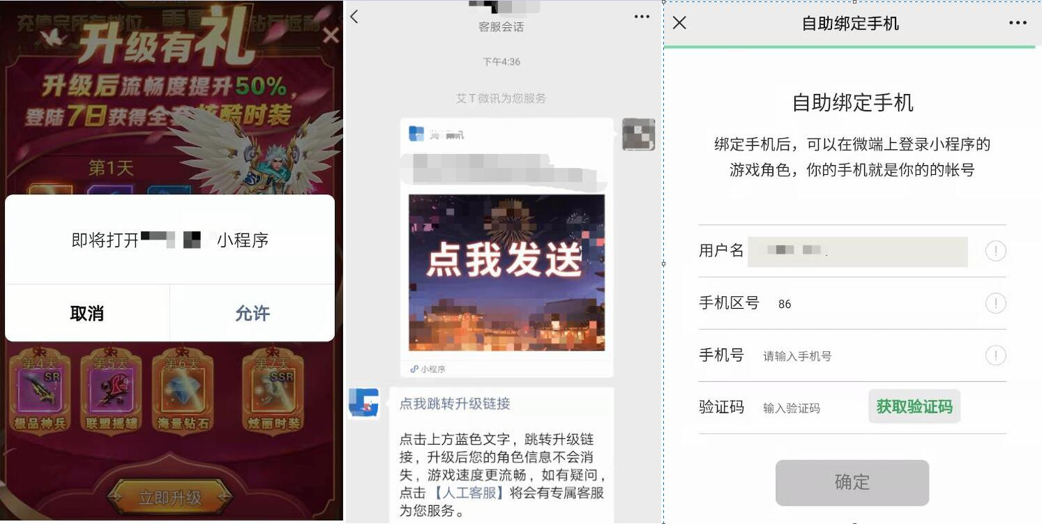 (b)小游戏内不提供完整的游戏服务,而利用客服、官方人员、官方群、游戏内置邮件、浮层图等途径使用“胁迫类”文案、公众号轮播图对抗等形式主动引导用户下载、转端、前往H5游戏。