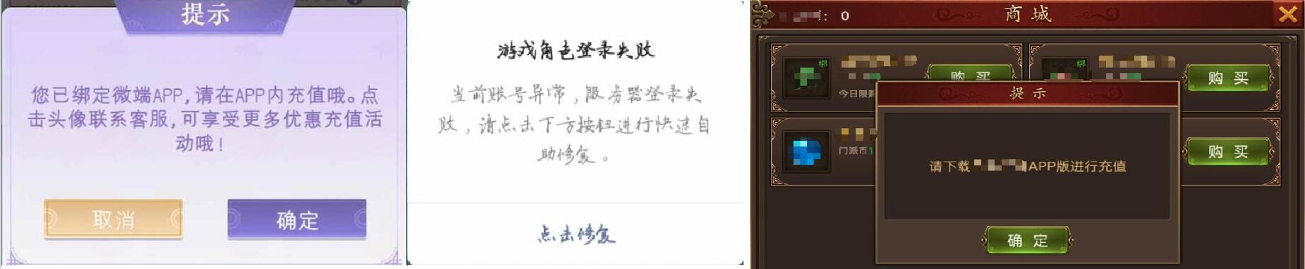 (1)开发者不得在小游戏内提供不完整的游戏服务,而要求或引导用户进入“非小游戏类目但运营游戏内容”的小程序、App、微端、H5游戏或“提供下载、运营游戏中心、提供道具/礼包购买服务”的公众号、直播间等渠道,以获得完整的游戏服务(包括但不限于游戏内容、游戏性能、充值优惠、客服质量等);开发者也不得针对小游戏用户进行虚假宣传,如宣称其他渠道可以体验到超出小游戏内的游戏服务或使用胁迫类文案、公众号轮播图、浮层图等方式对抗、触达小游戏用户。现就部分违规行为举例如下:
