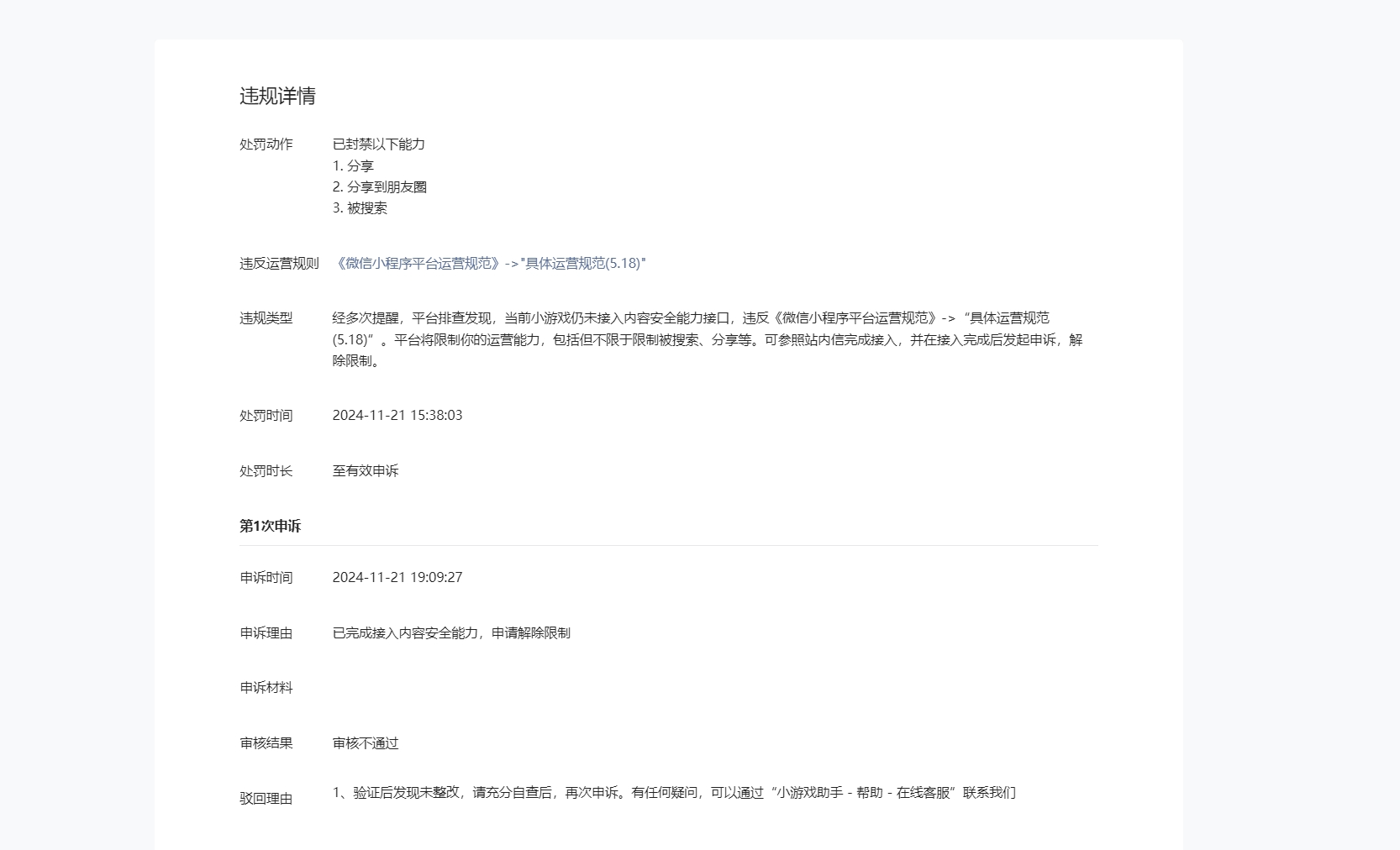 你好,我们已经对小游戏内容安全能力进行了升级,并且自查进行了接入,但是依然因为未完全接入安全能力,导致了被限制能力,我们已经验证自查多次,接入的场景是没有问题的,请问一下这个要怎么处理,目前是完全不知道是哪个板块未接入,导致的处罚限制能力。