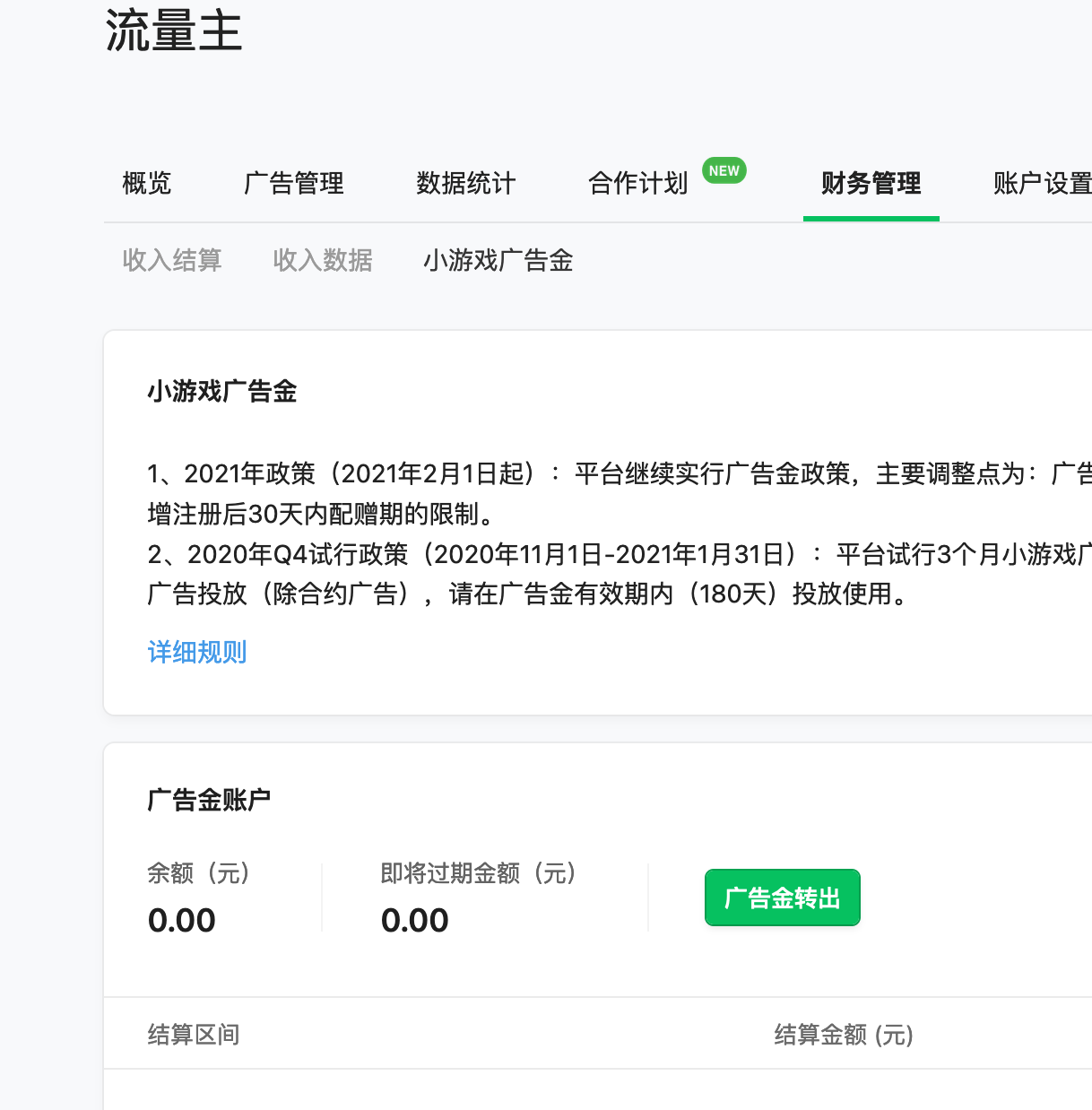 我们用和小游戏同主体的公众号给小游戏进行MP投放,产生的广告金在‘小游戏数据助手’小程序里可以看到数据,但是在小游戏的流量主后台并没有数据,请问这个广告金要怎么领取和使用呢?