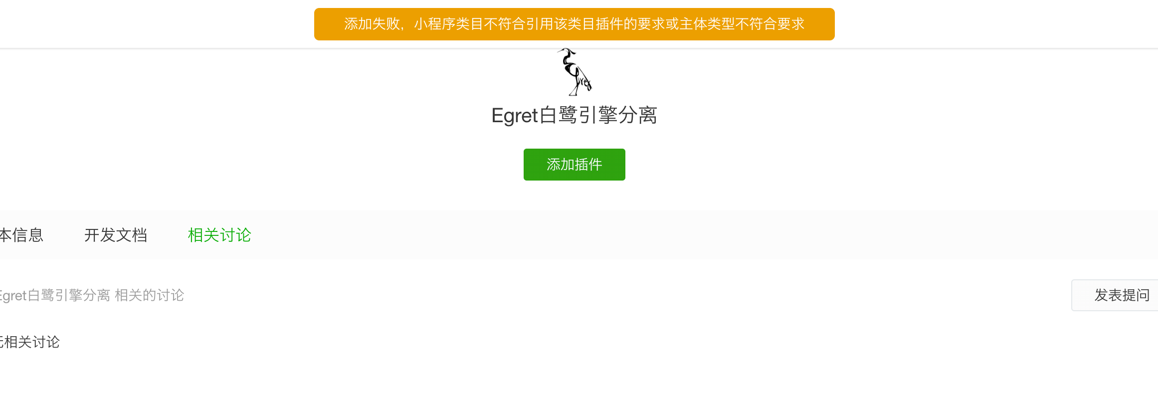 在《Egret白鹭引擎分离》插件主页点击“添加插件”总提示“添加失败,小程序类目不符合引用该类目插件的要求或主体类型不符合要求”