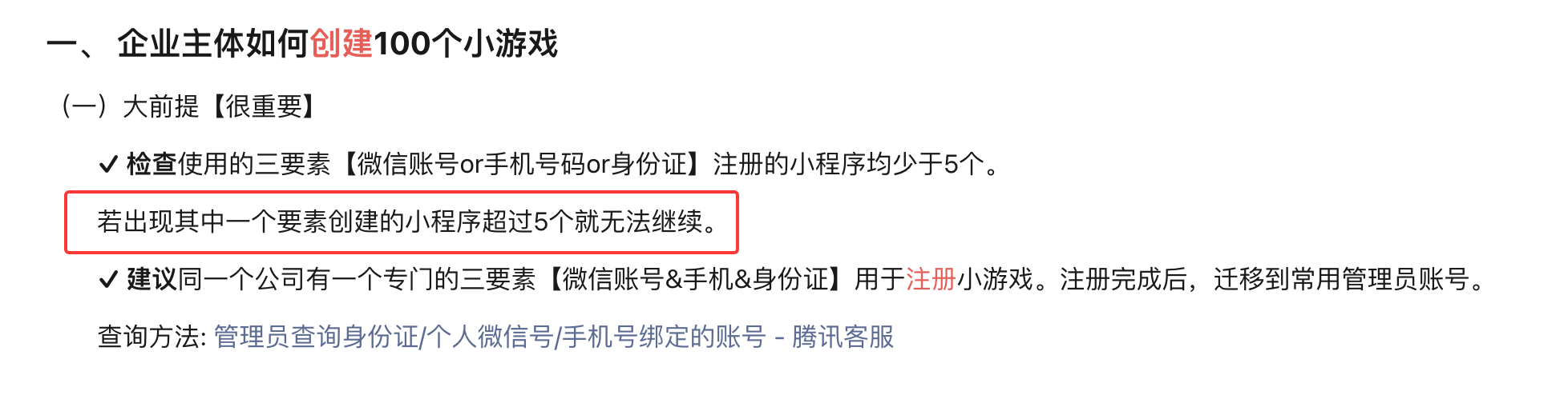 ✓ 建议同一个公司有一个专门的三要素【微信账号&手机&身份证】用于注册小游戏。注册完成后,迁移到常用管理员账号。