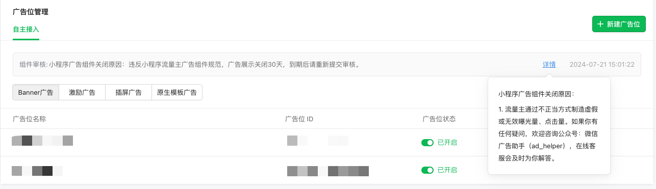 刚在流量主后台收到广告展示关闭30天的通知,如下: