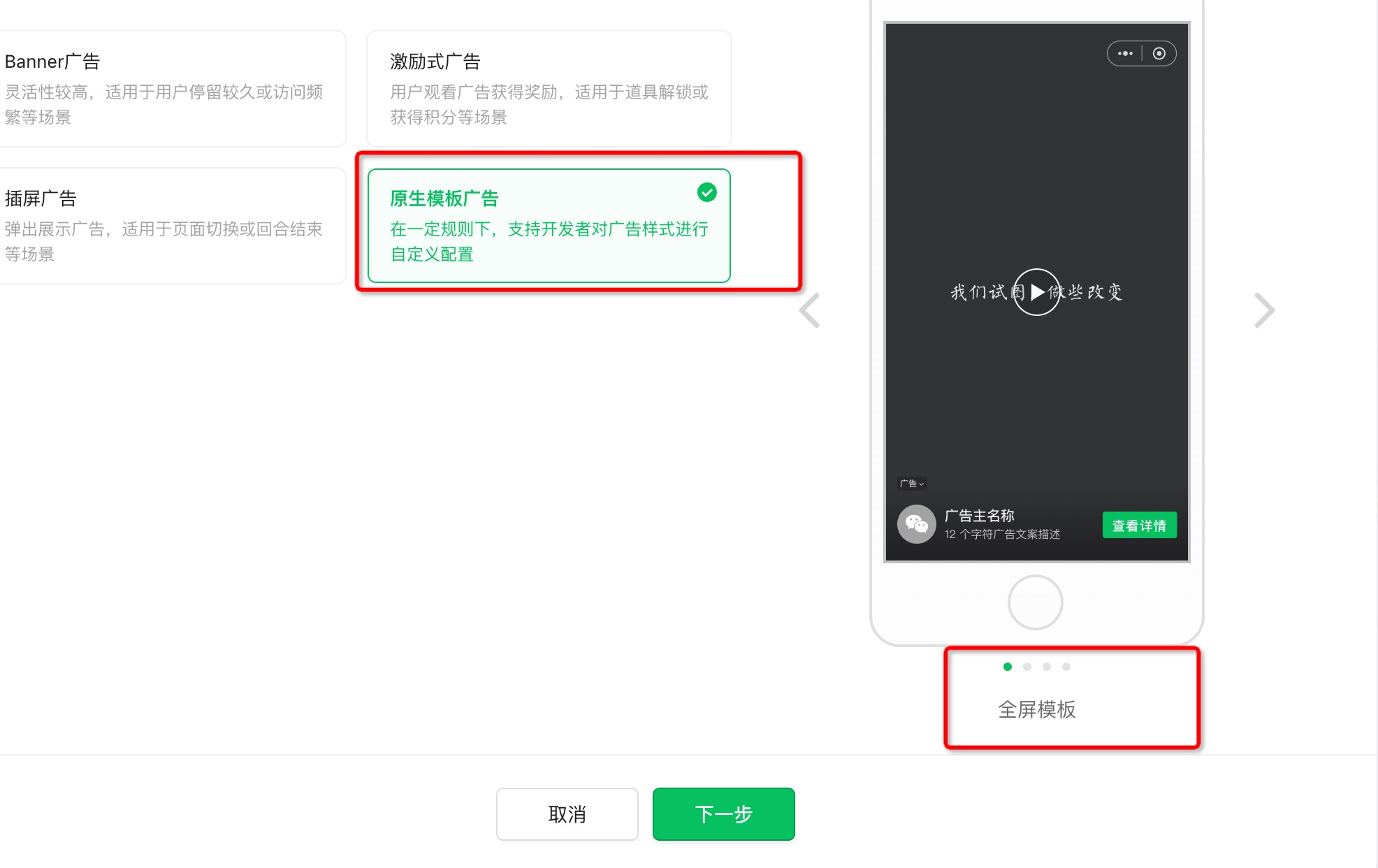 你好,因小游戏类型,现只支持创建单格子原生版本广告位,全屏原生模版广告只适用非游小程序。